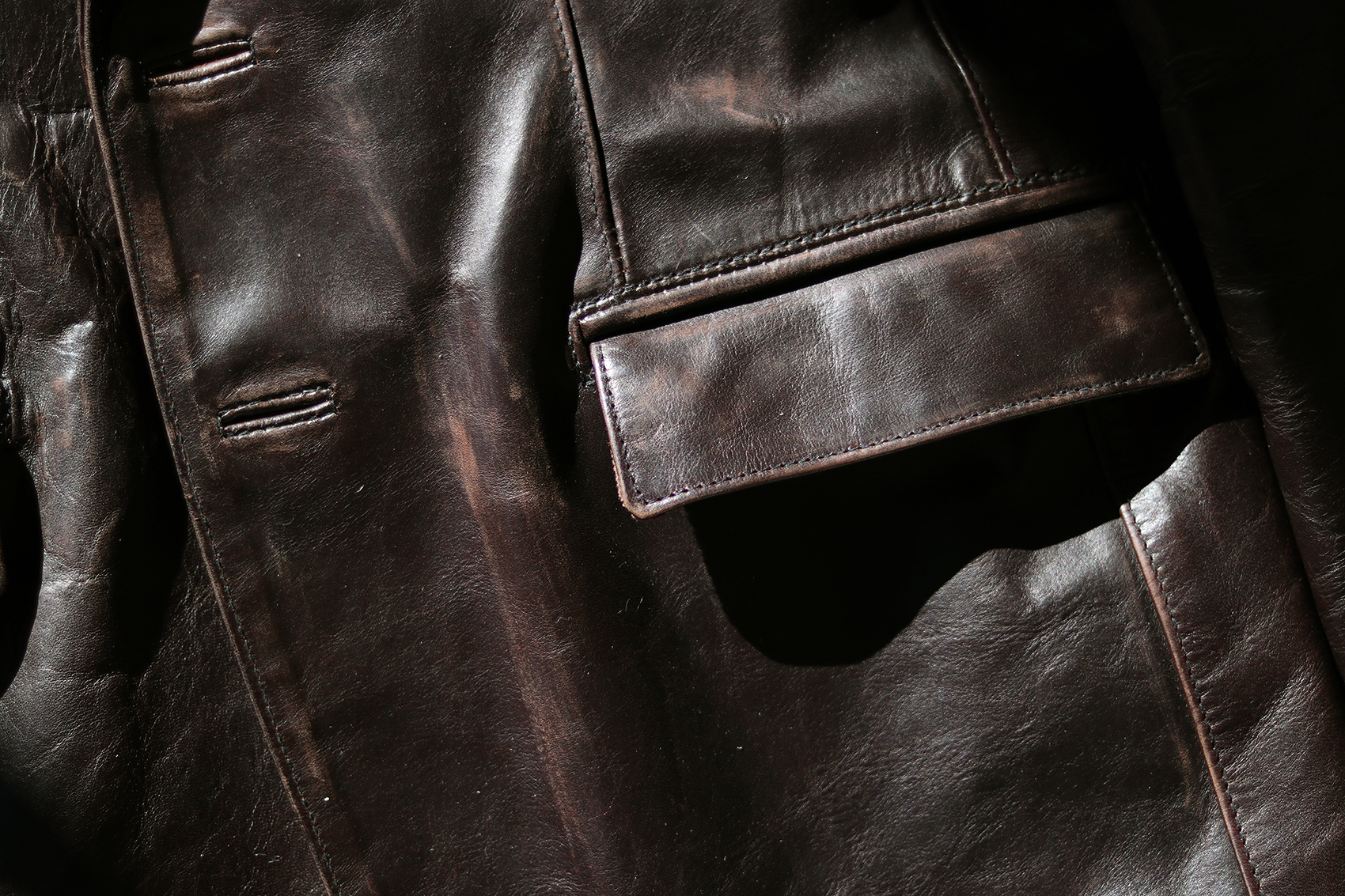 明るめのブラウンが下地なので、表面のブラックとの濃淡が楽しめるレザーです。着ていくことで生まれる風合いやシワもそうですが、色の移ろいも楽しめるレザーです。