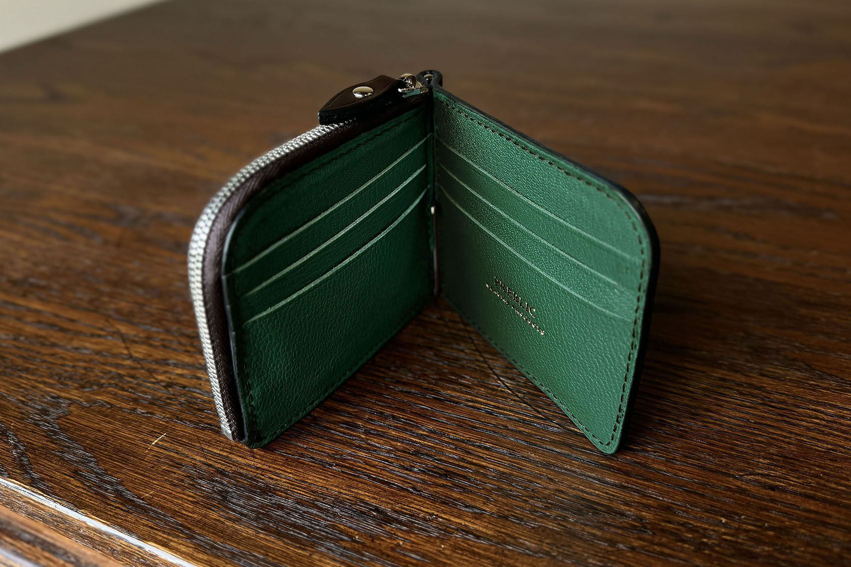 一見、外見は渋めですが、開くとグリーンが映えます。