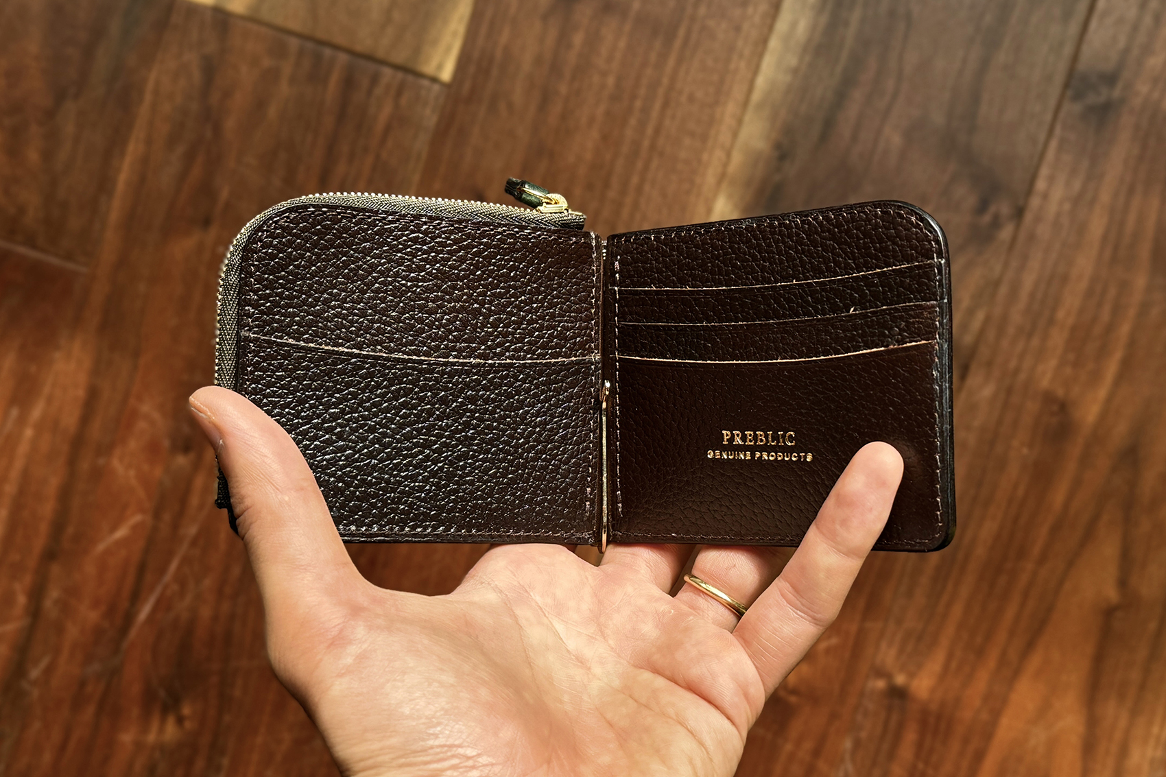 真ん中のクリップで紙幣を挟み、左右にはカード室、